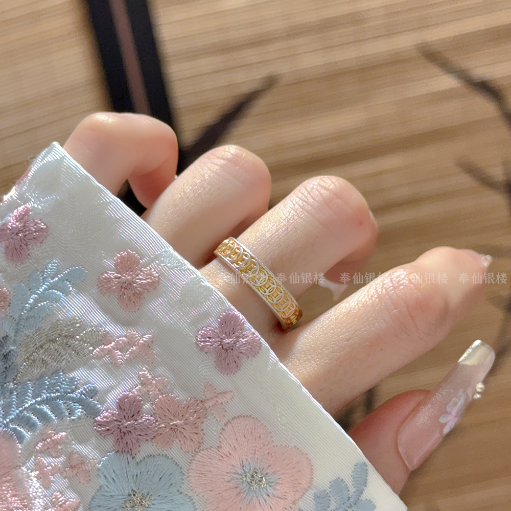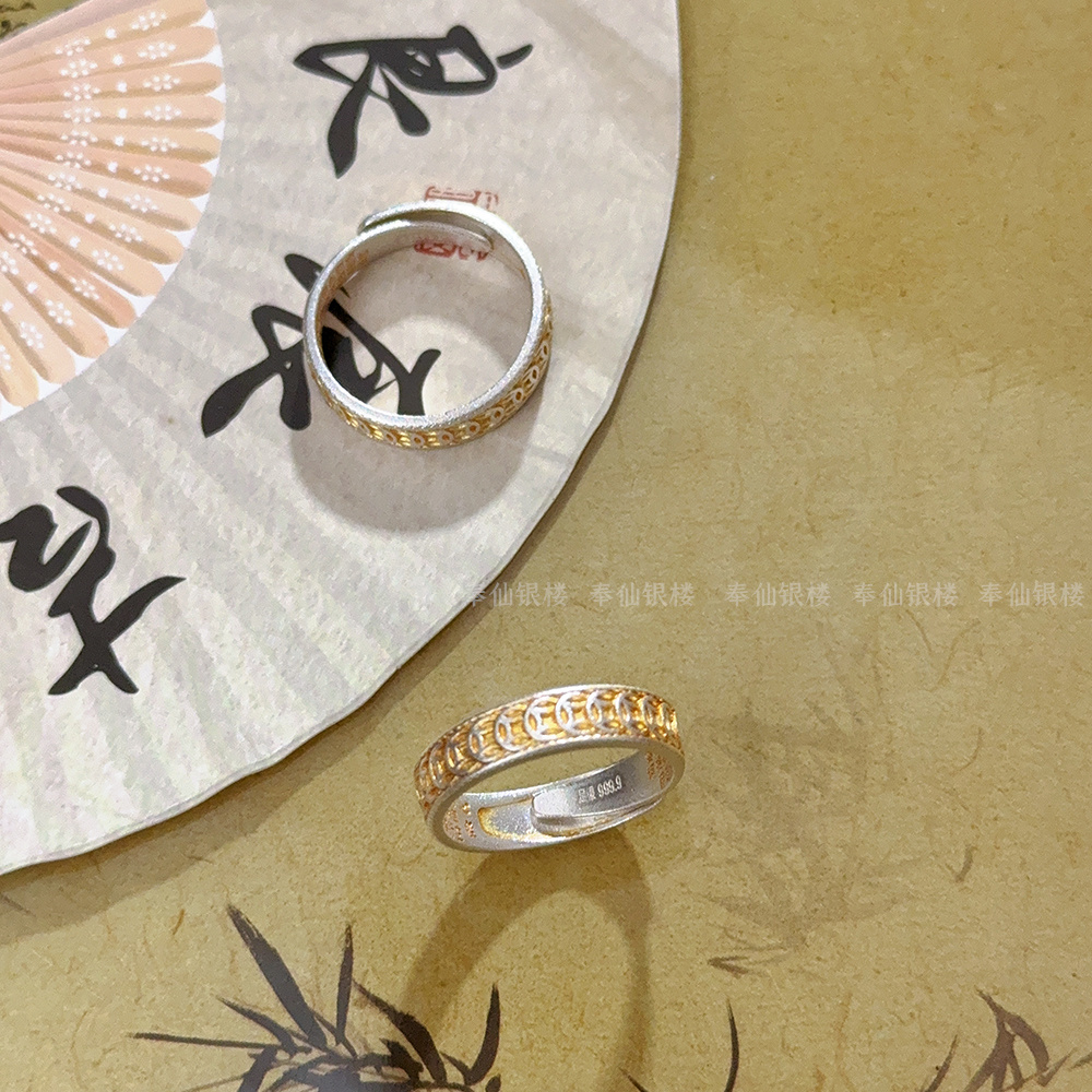 999.9 pure silver copper coin gold-painted silver ring, sterling silver fortune ring