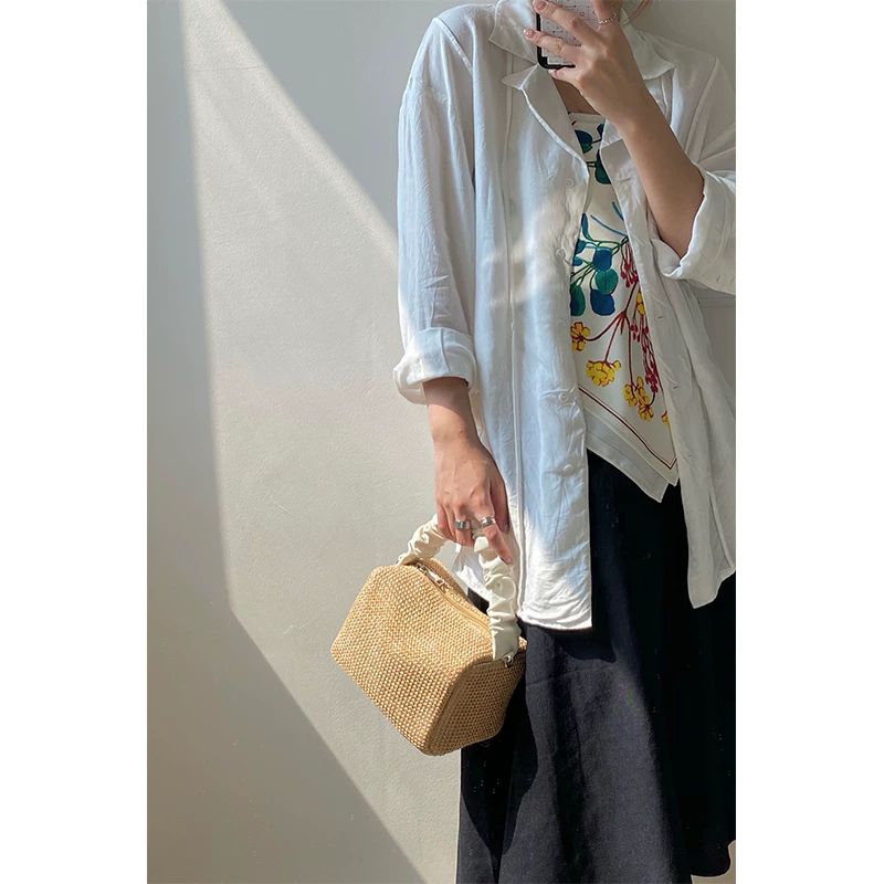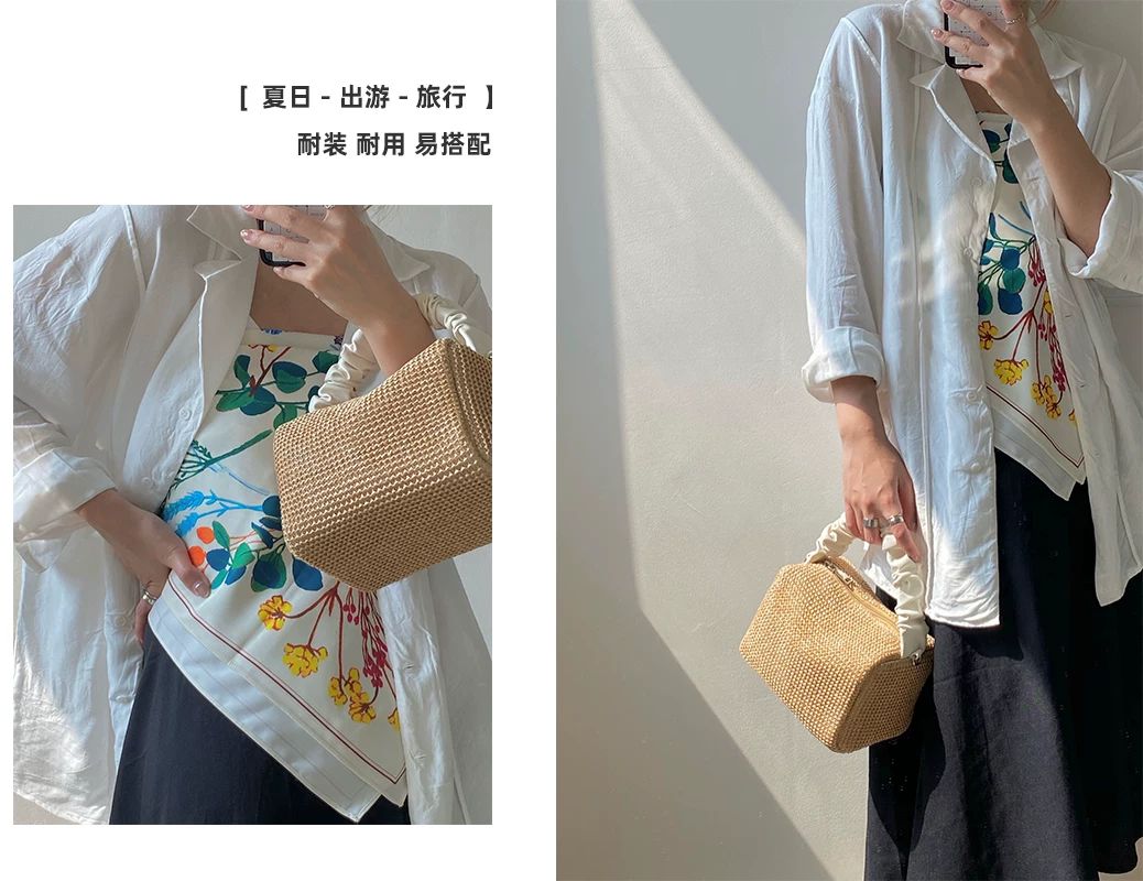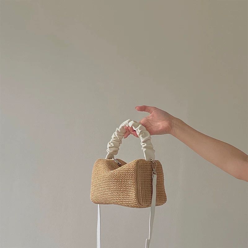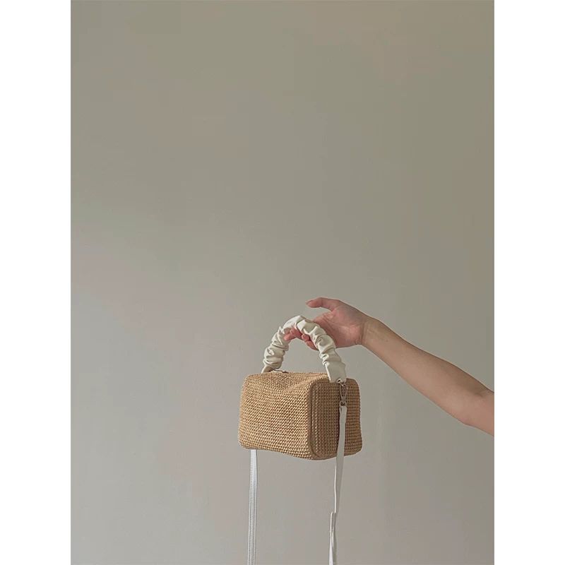 Hand-woven straw pleated contrasting color square handbag and crossbody bag