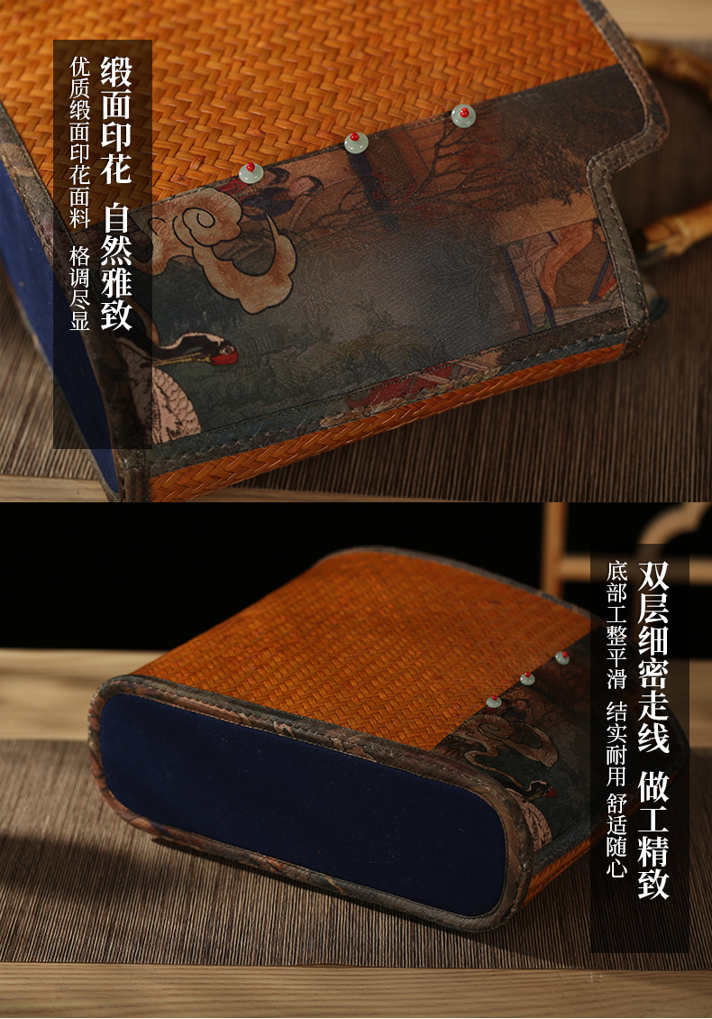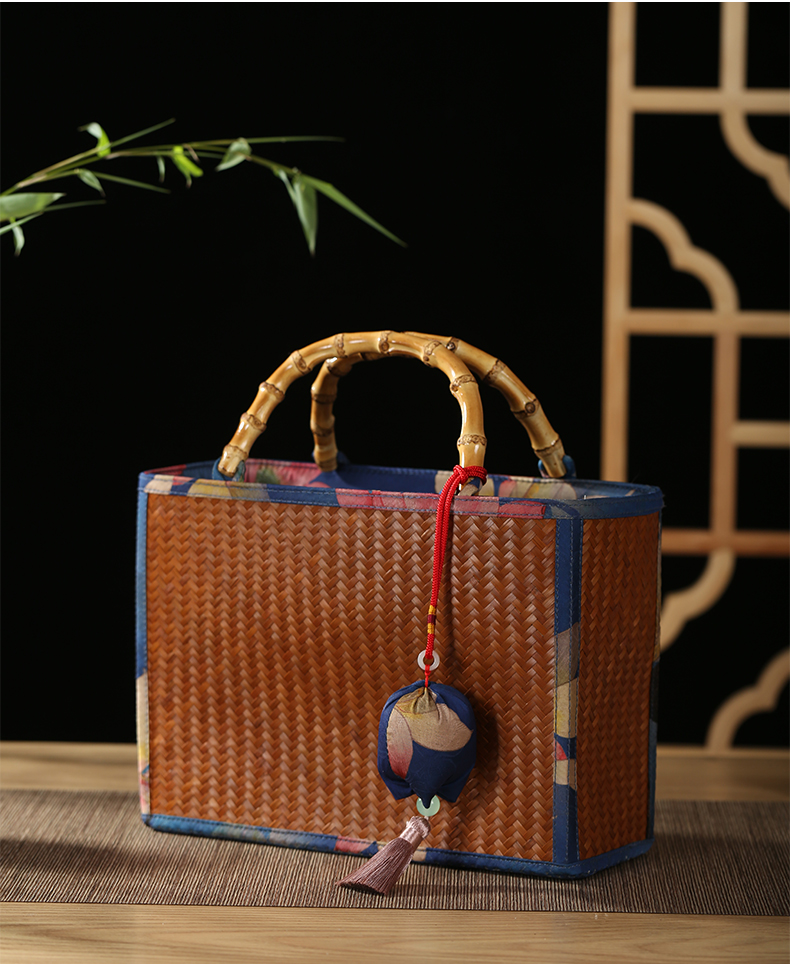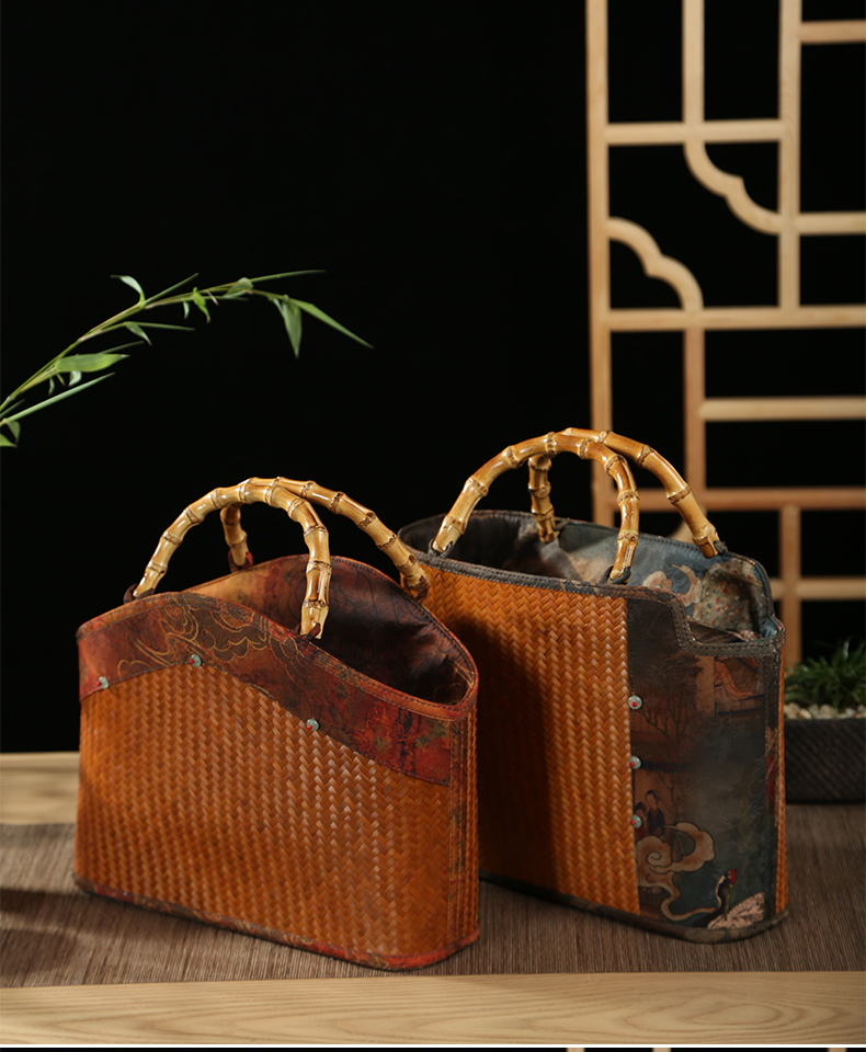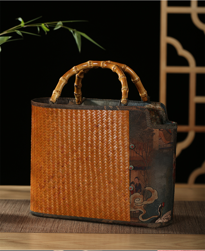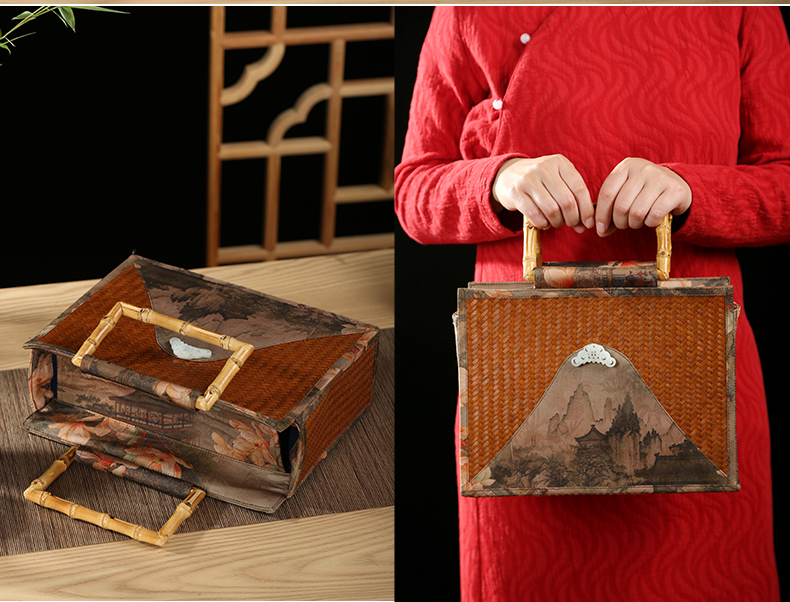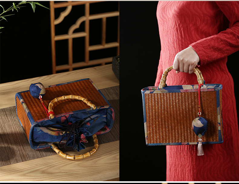 Handmade bamboo woven Chinese satin bag Zen square handbag, Chinese ancient style woven ethnic style retro women's bag