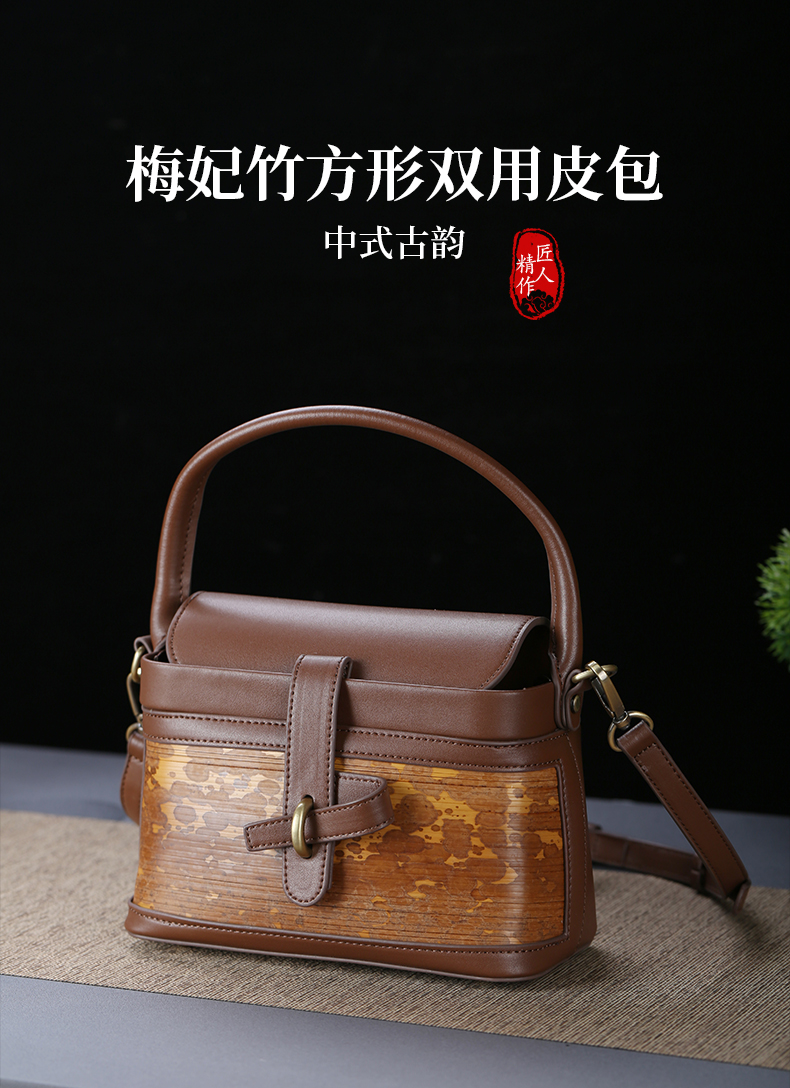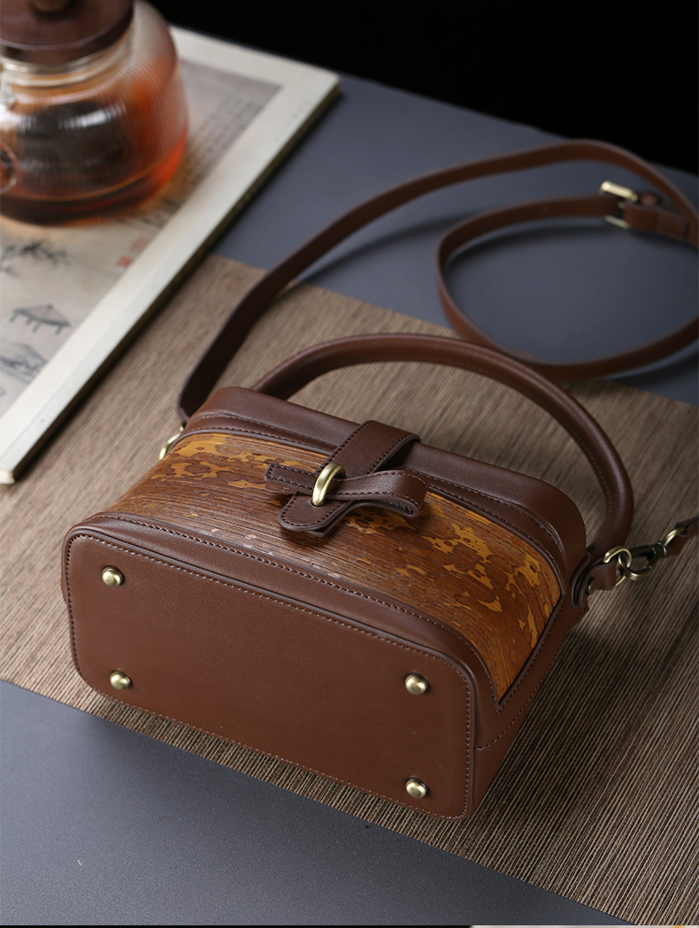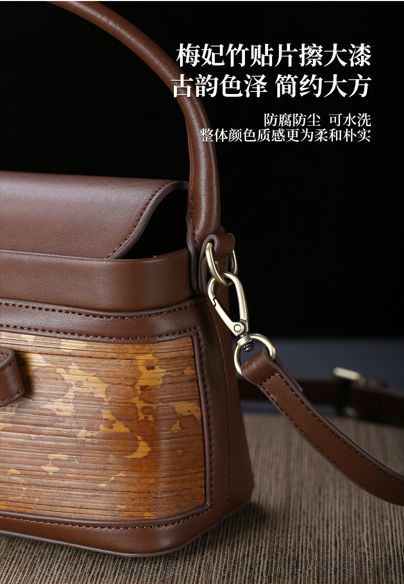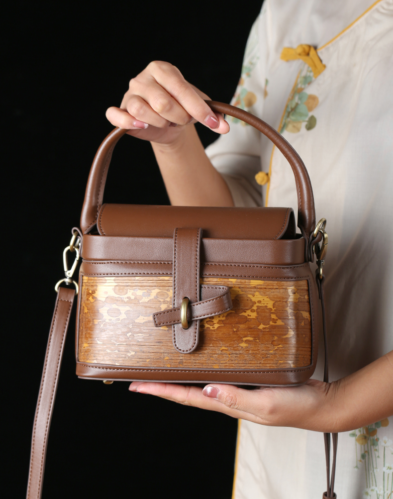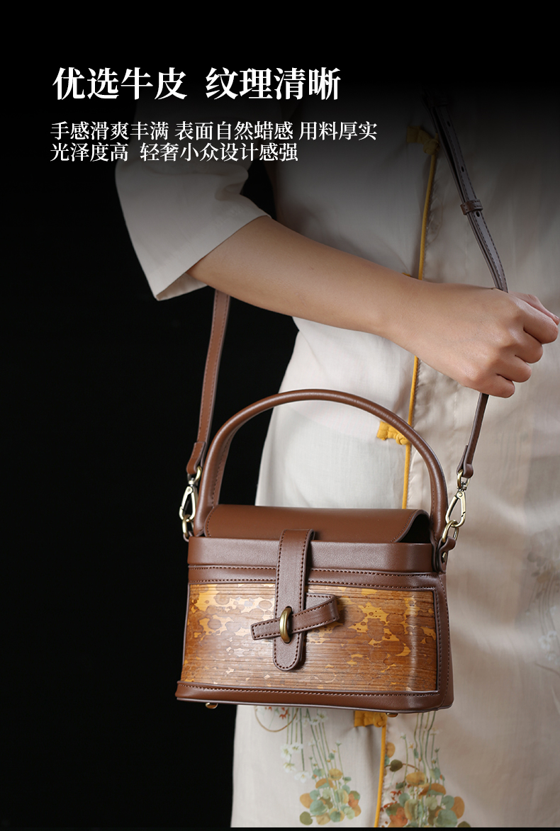 Handmade Meifei bamboo square cowhide, single-handle, crossbody bamboo bag