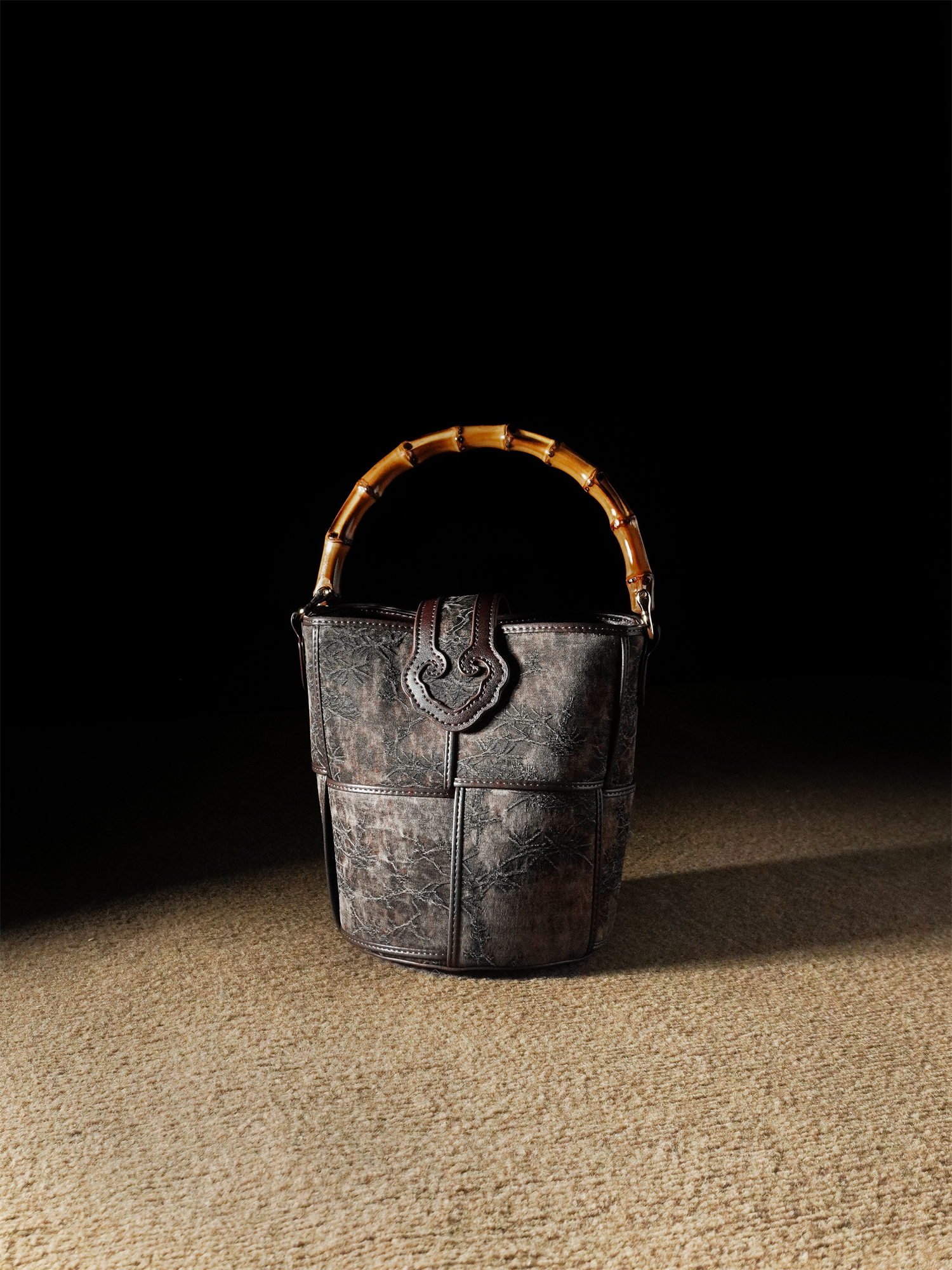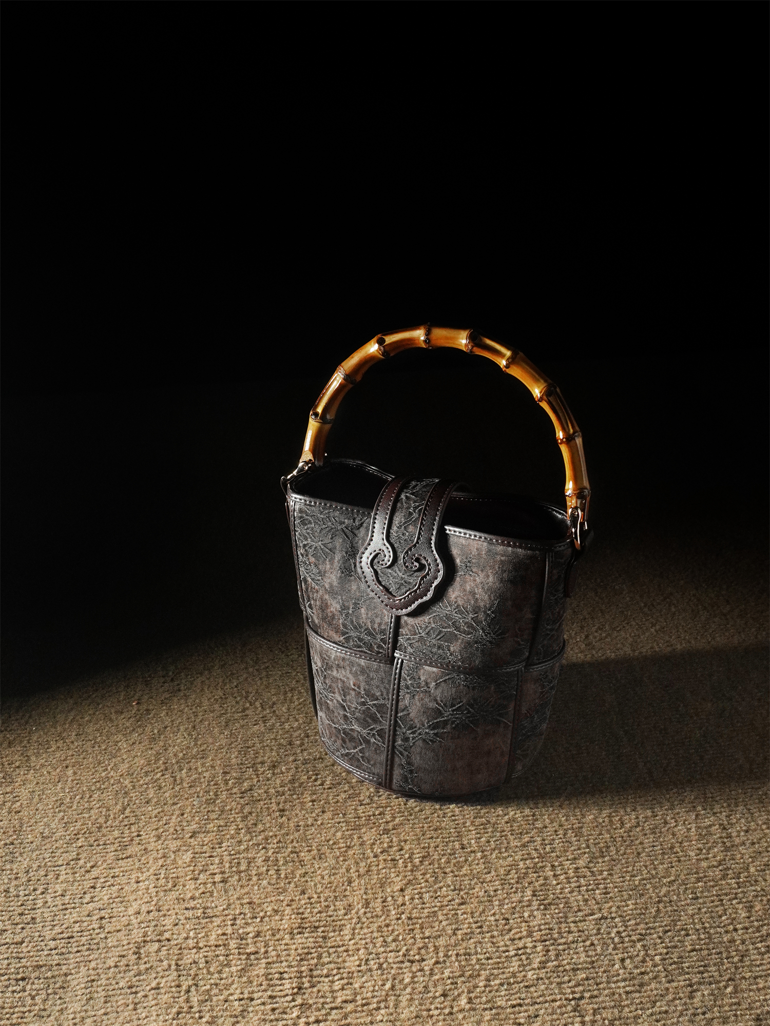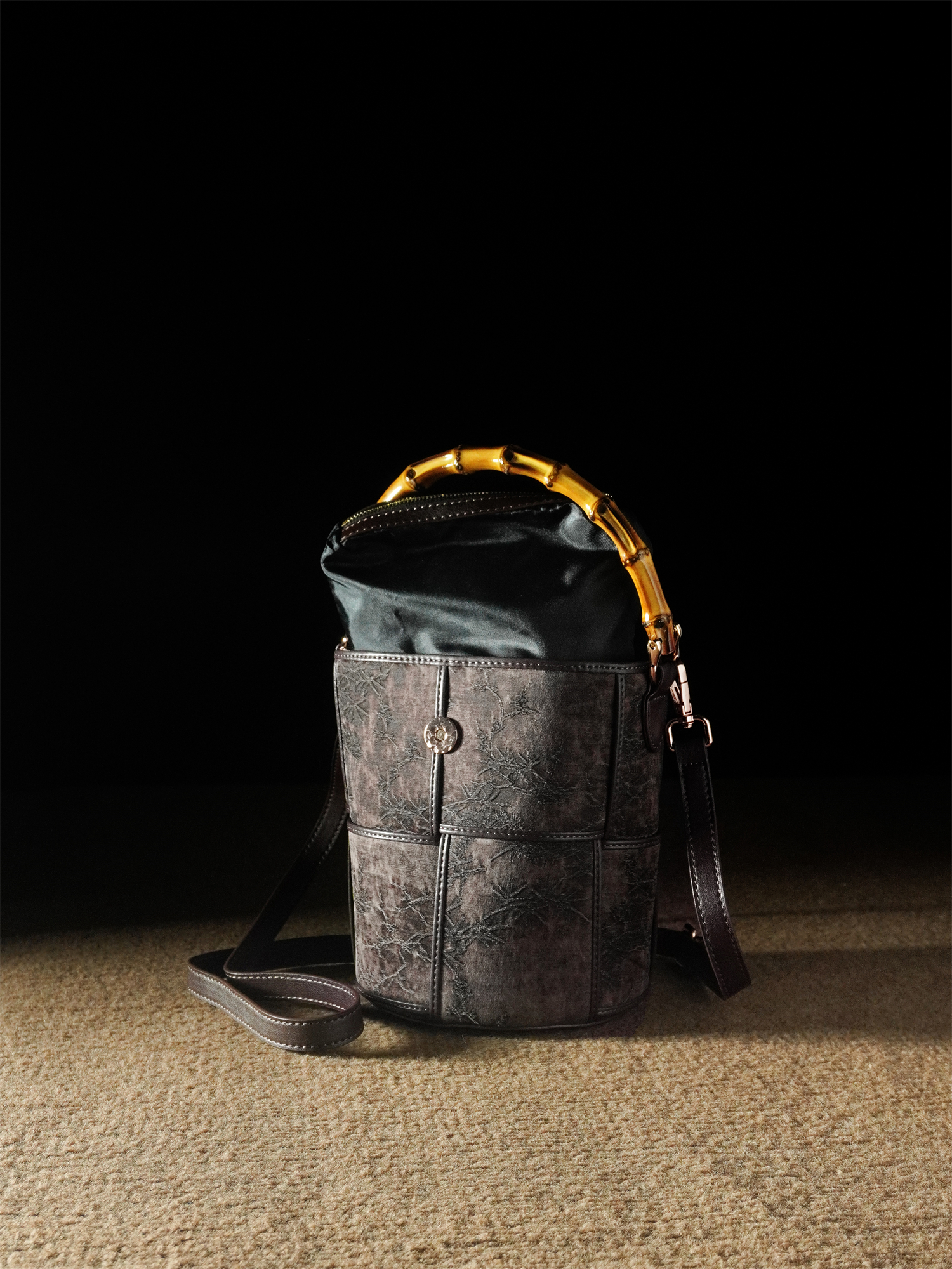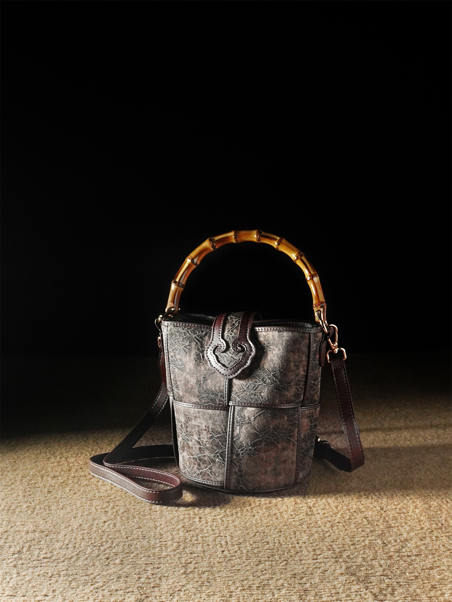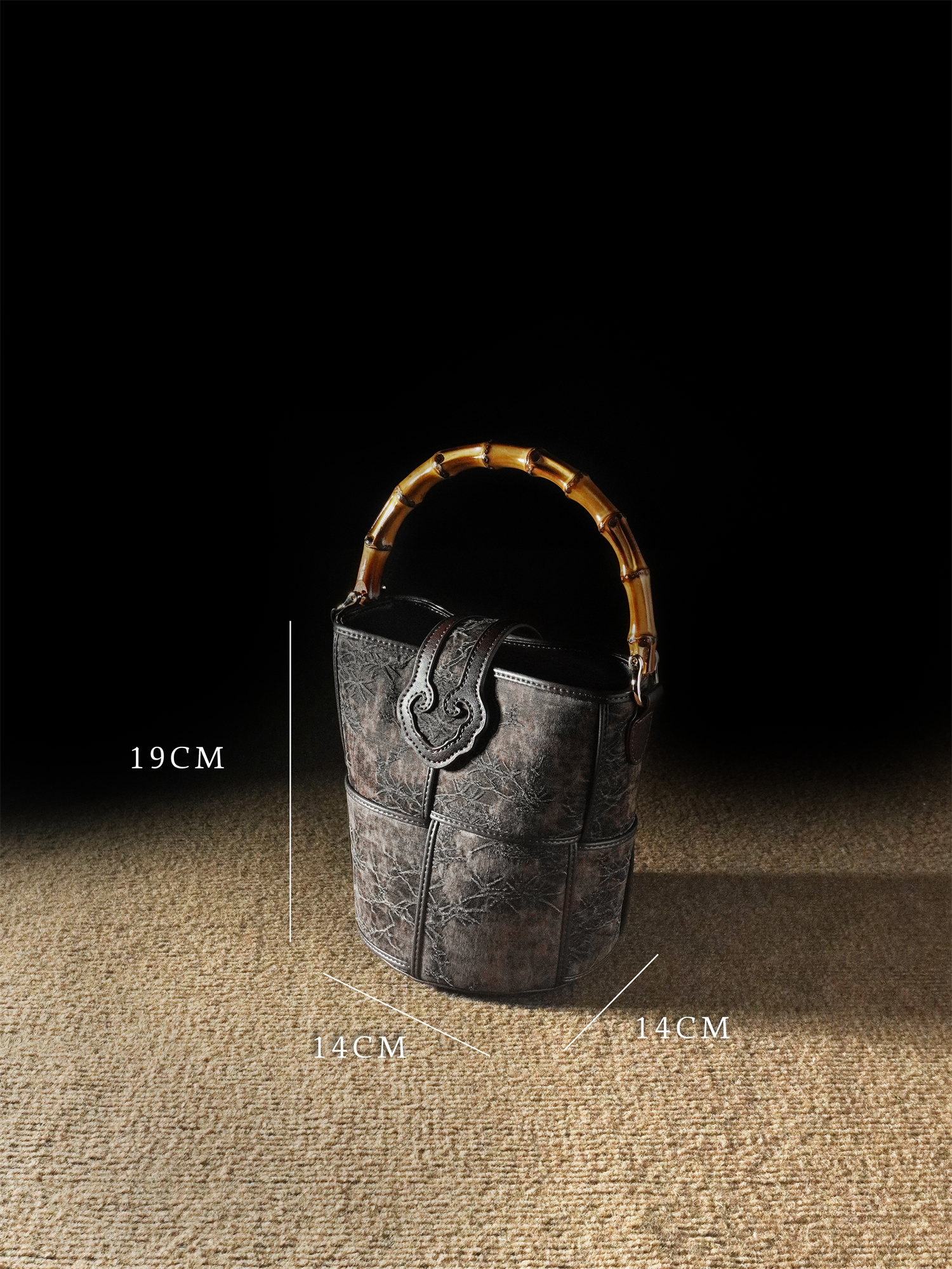 Xiangyunsha bucket bag, bamboo-knotted cowhide shoulder bag for women