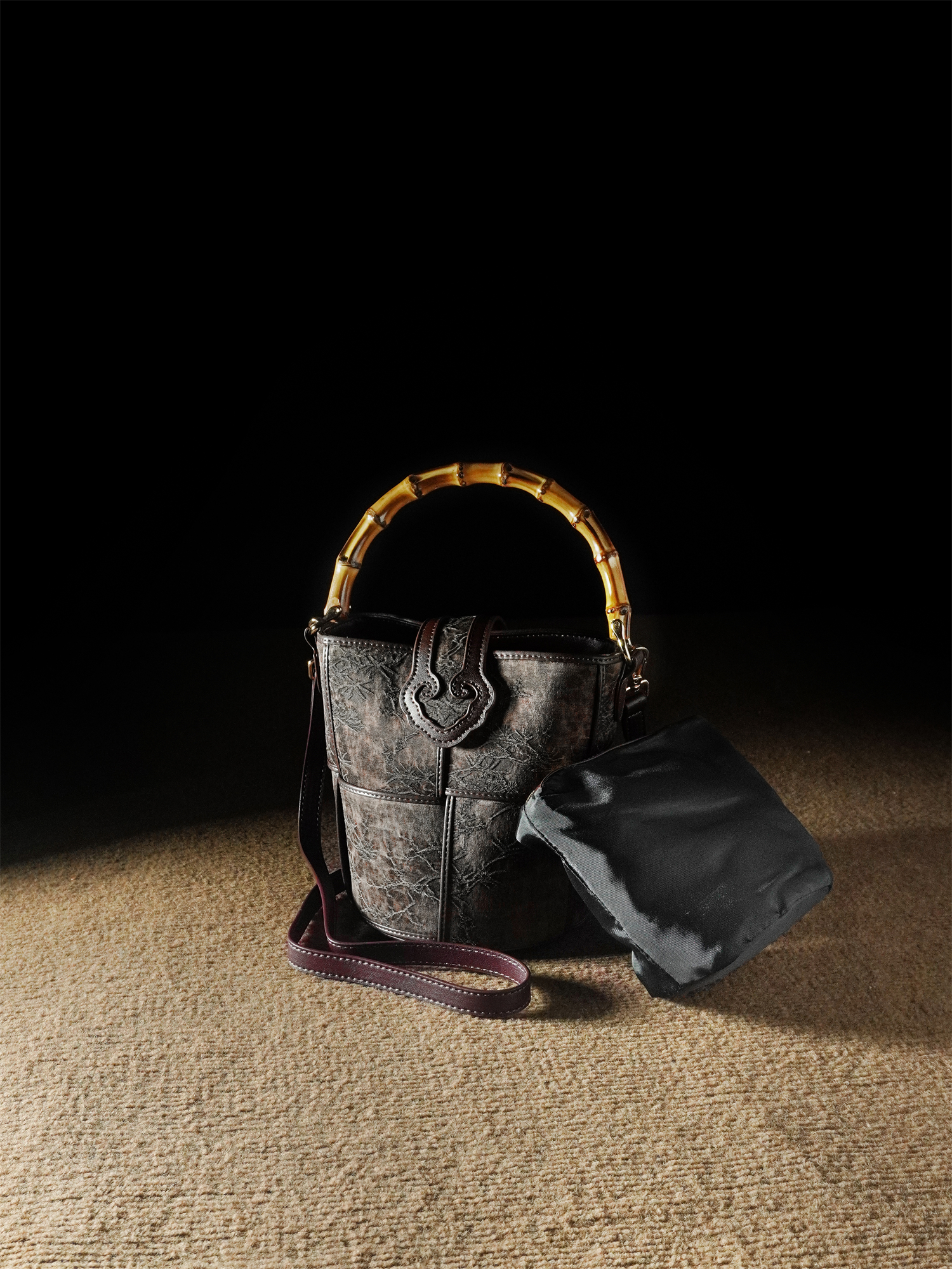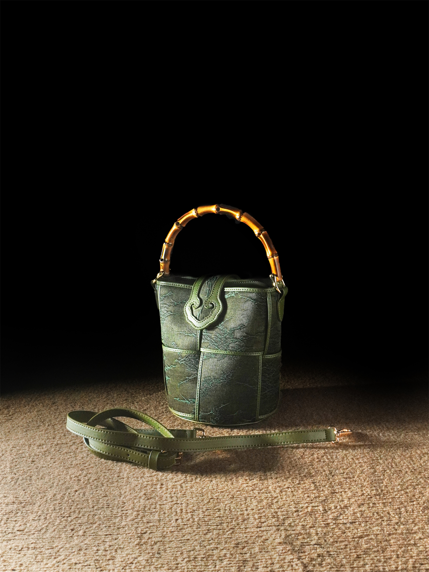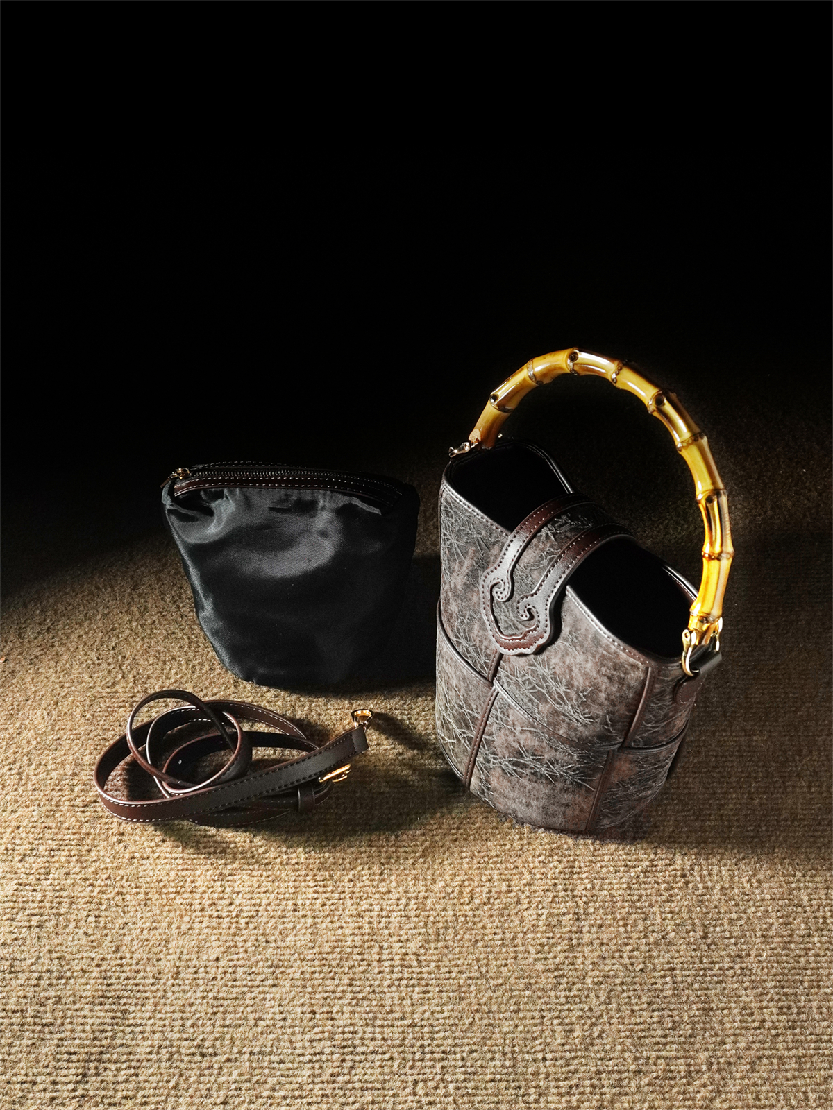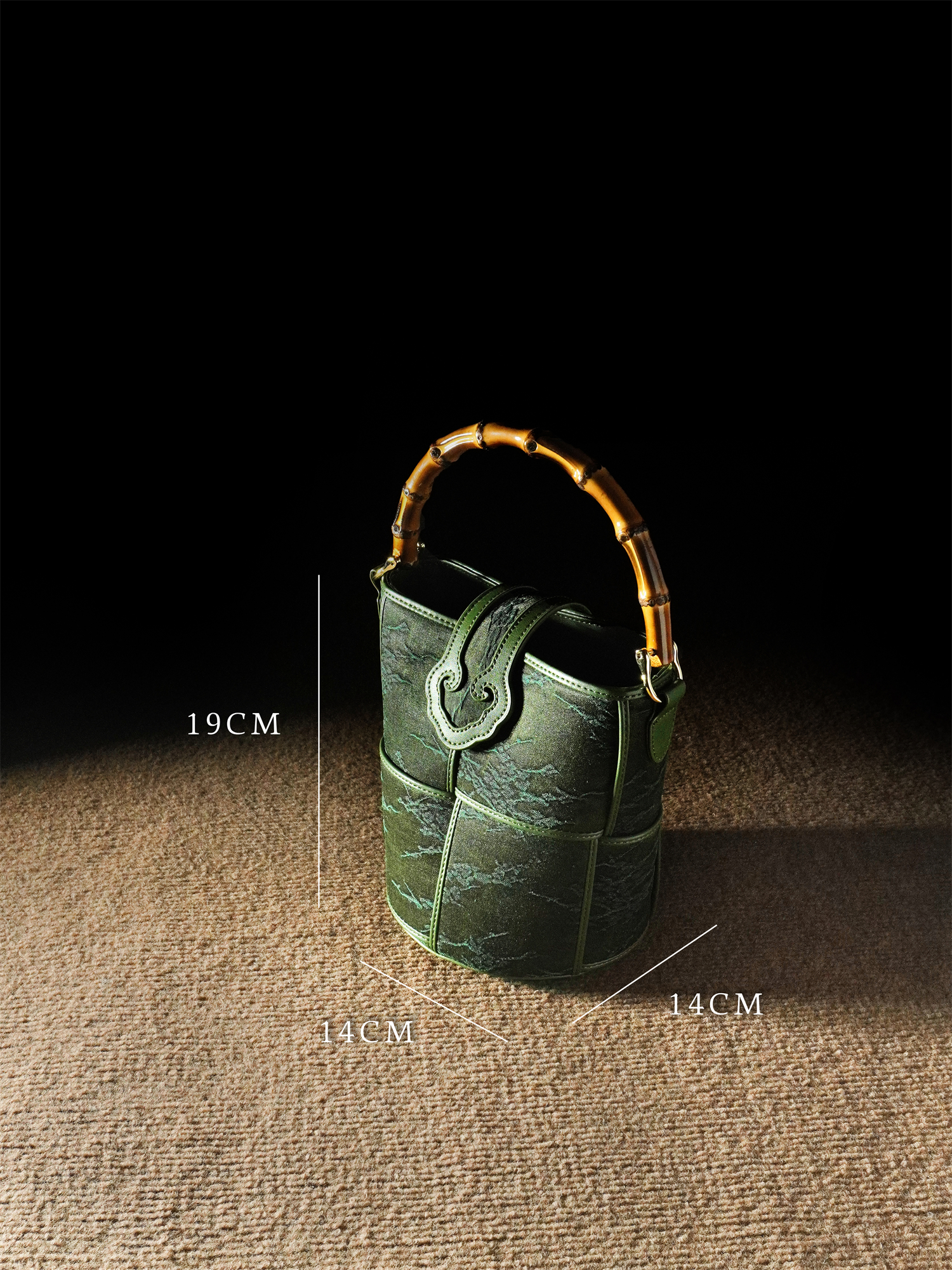 Xiangyunsha bucket bag, bamboo-knotted cowhide shoulder bag for women