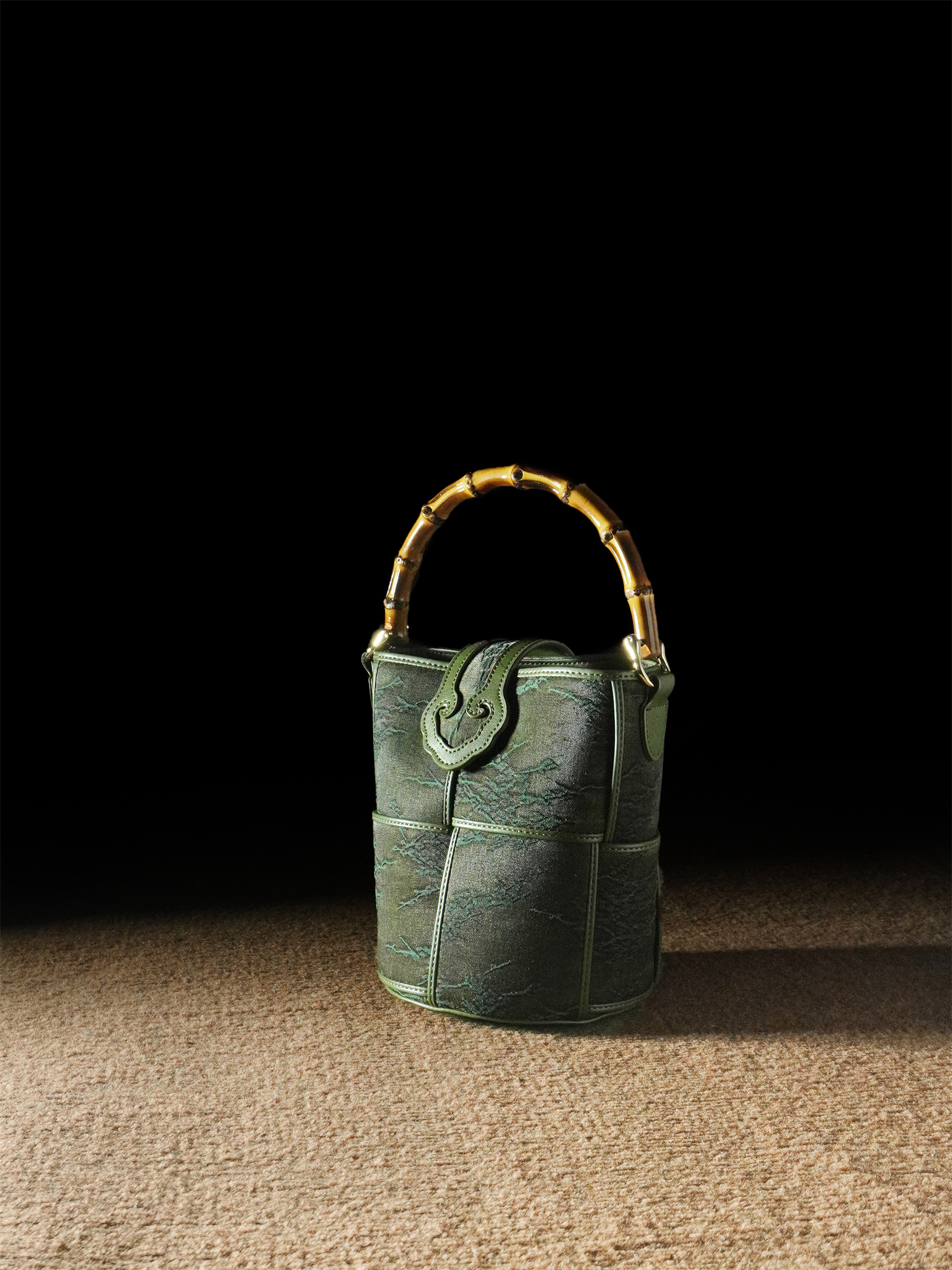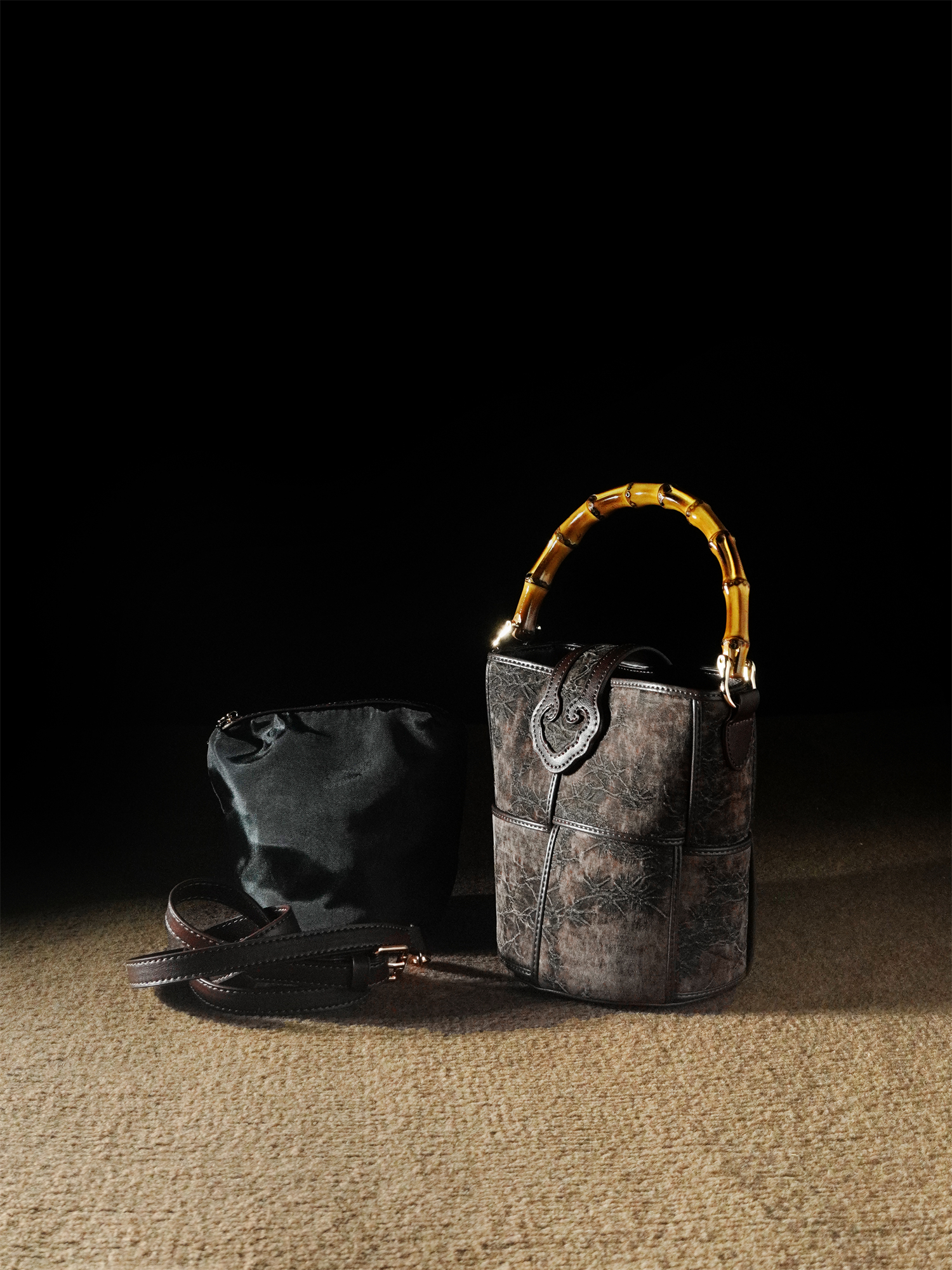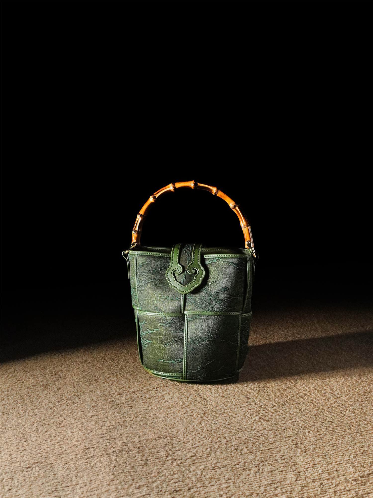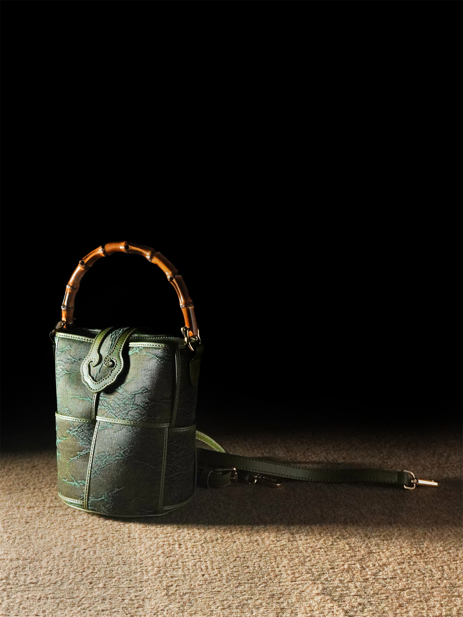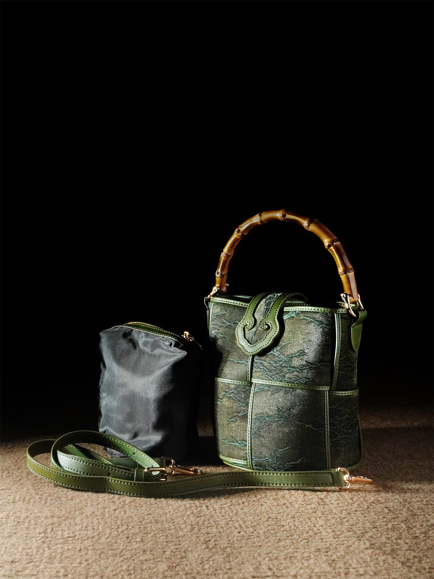 Xiangyunsha bucket bag, bamboo-knotted cowhide shoulder bag for women