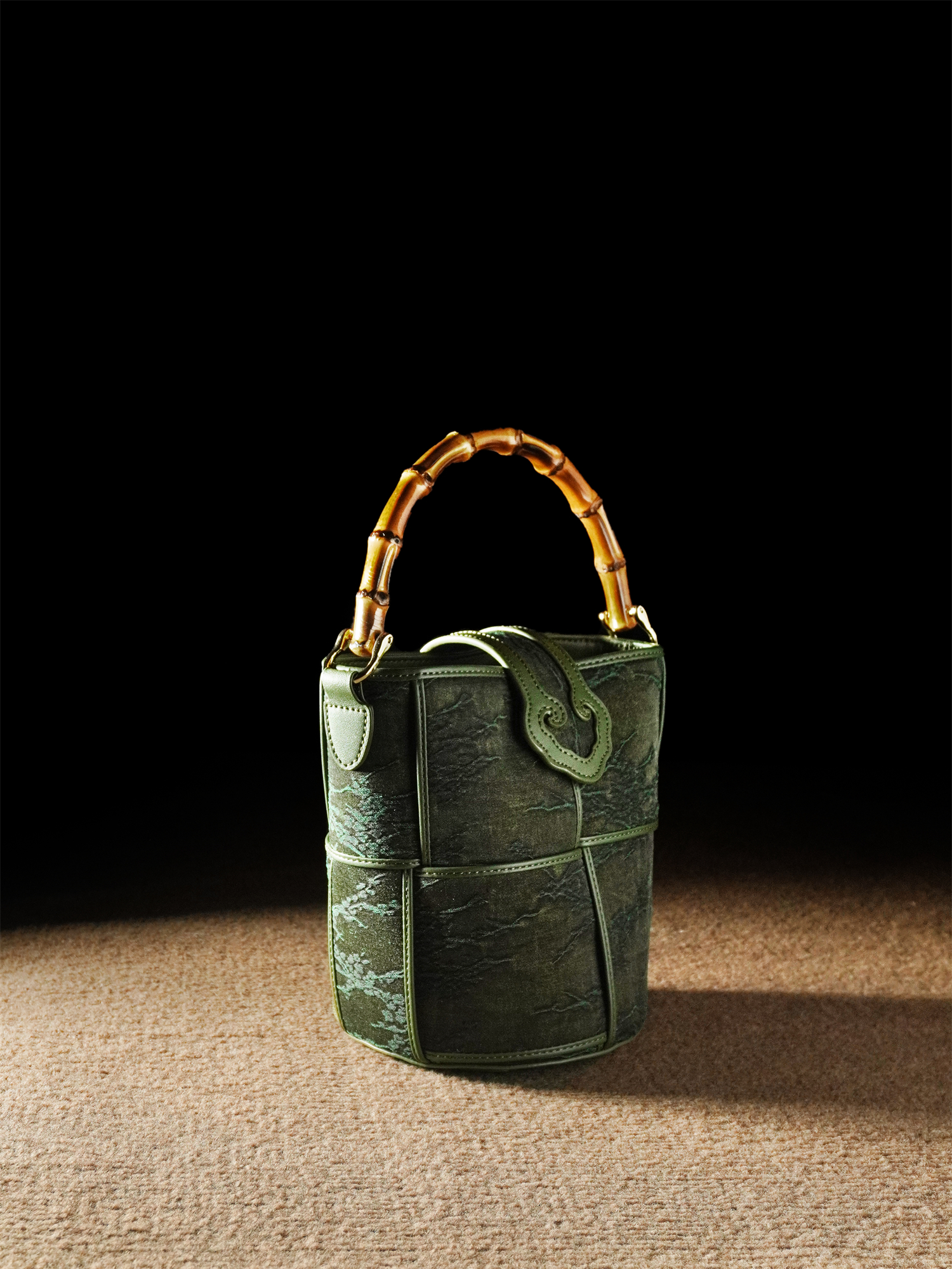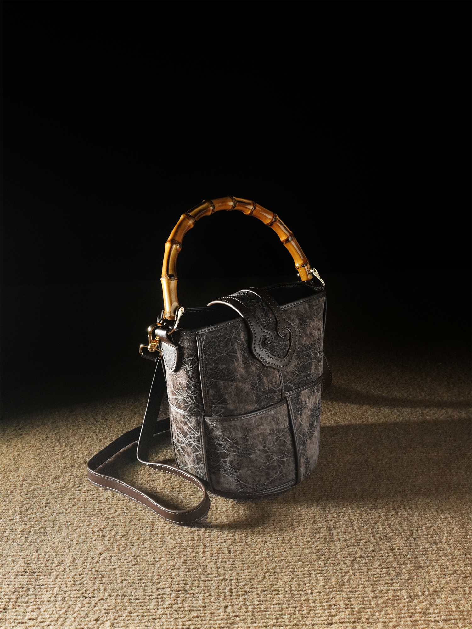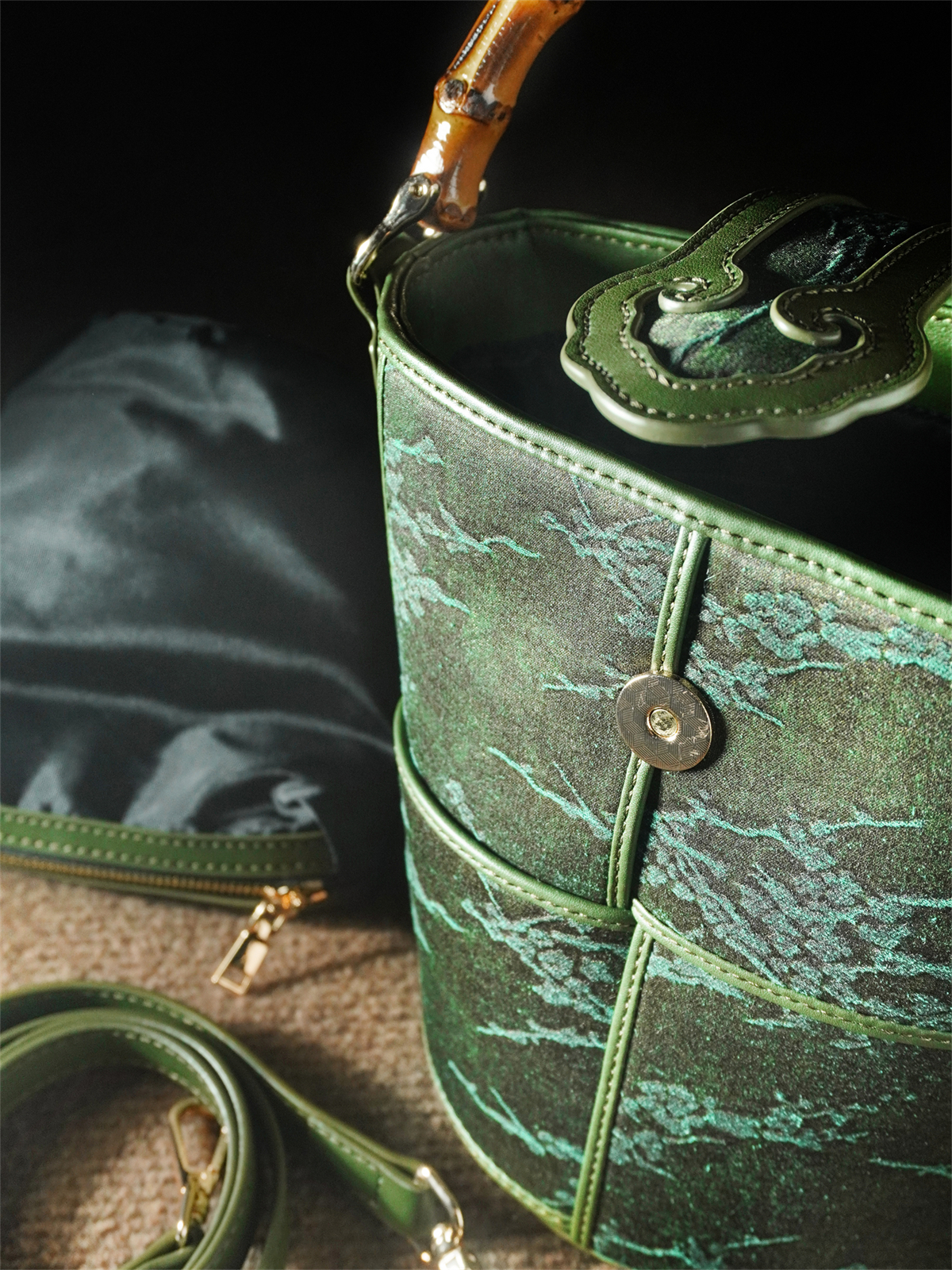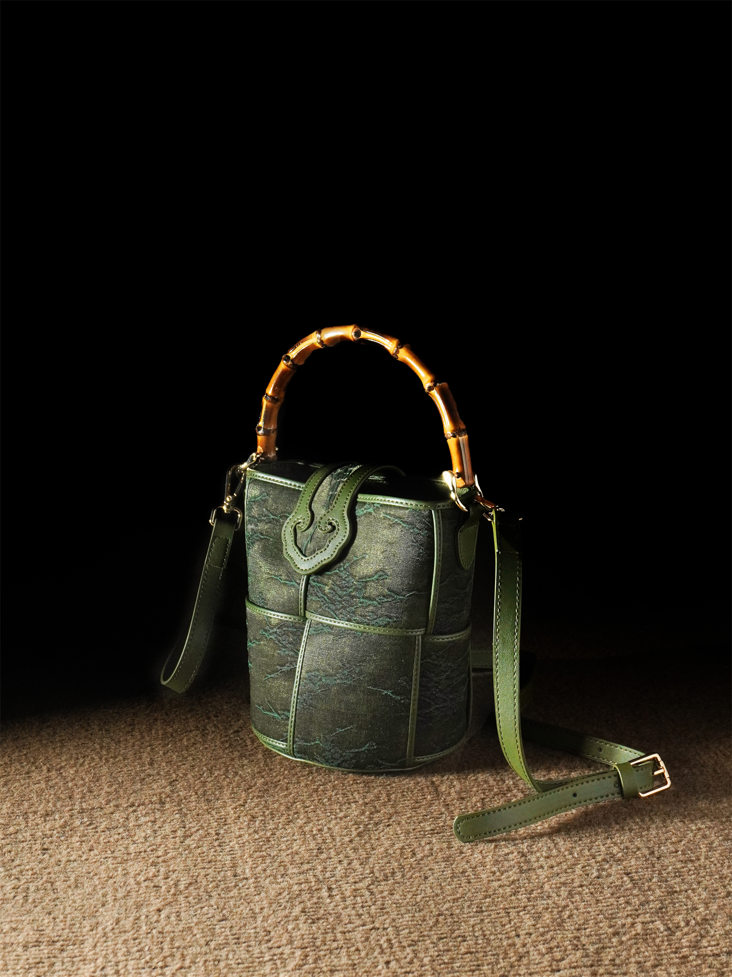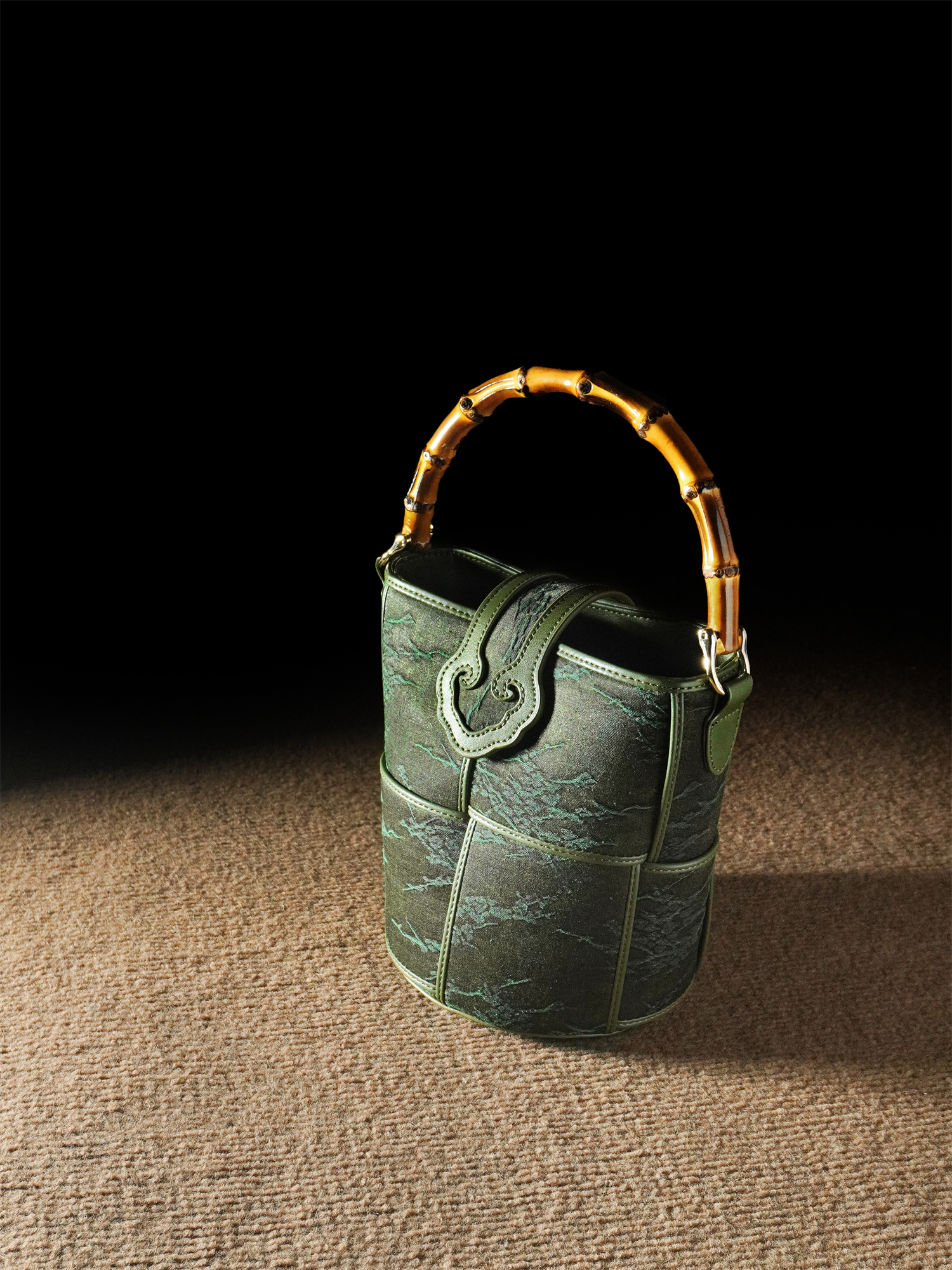 Xiangyunsha bucket bag, bamboo-knotted cowhide shoulder bag for women