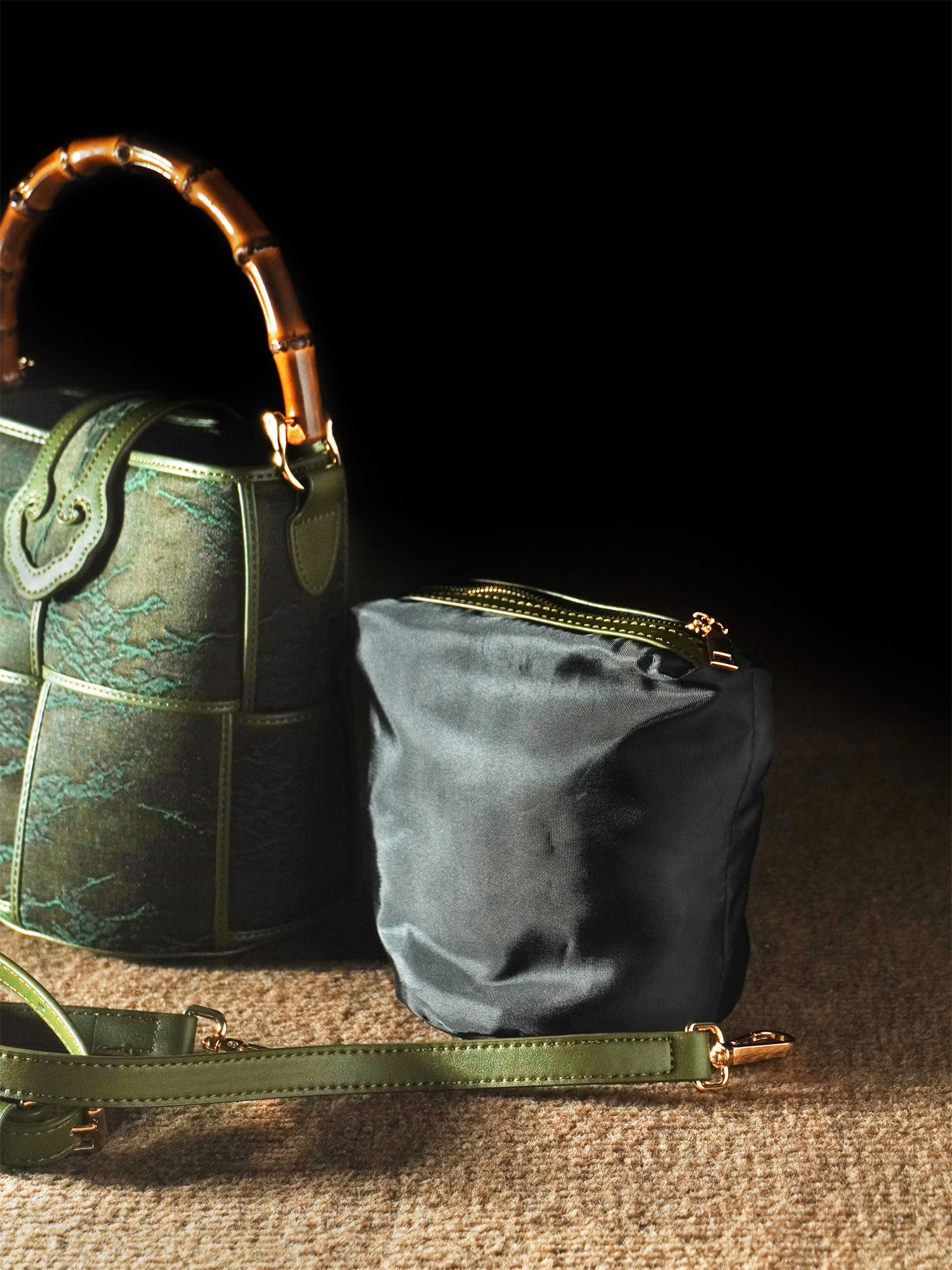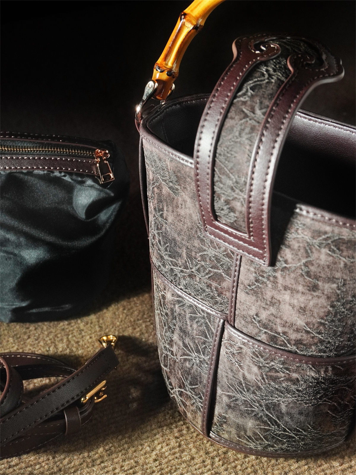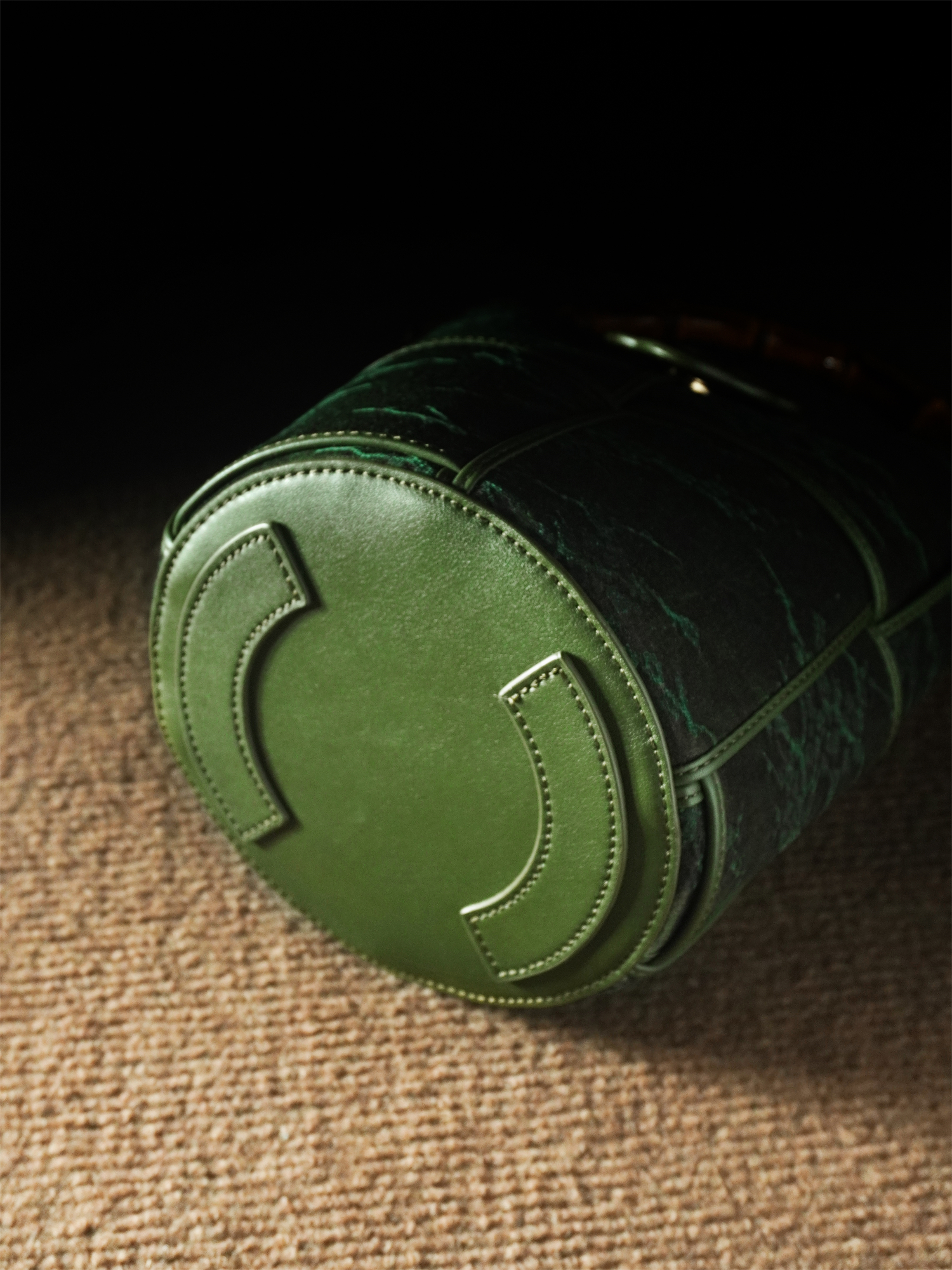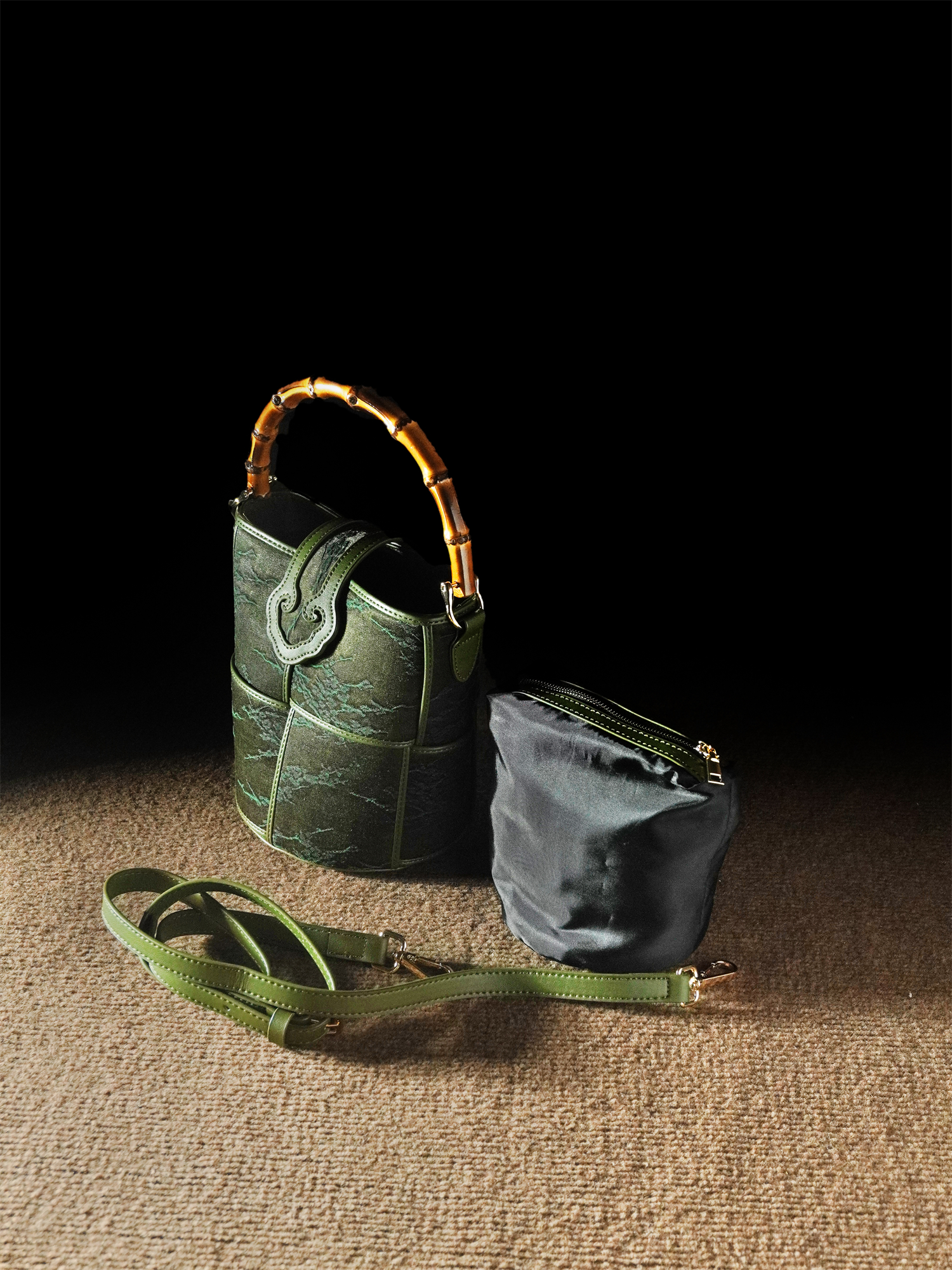 Xiangyunsha bucket bag, bamboo-knotted cowhide shoulder bag for women